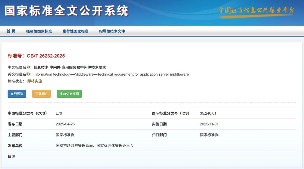 应用服务器中间件作为企业级业务系统的运行中枢,通过高效资源调度与全链路服务管控,支撑政务云百万并发用户服务、金融核心系统7×24小时无间断运行、能源行业海量实时数据毫秒级响应,为数字政府、智慧医疗、高端装备制造等场景提供稳定、安全、可扩展的技术底座。GB/T 26232-2025《信息技术 中间件 应用服务器中间件技术要求》的正式发布为产品研发、系统集成与质量评测提供统一标尺,对提升企业级应用稳定性、促进数字化转型具有重要意义。